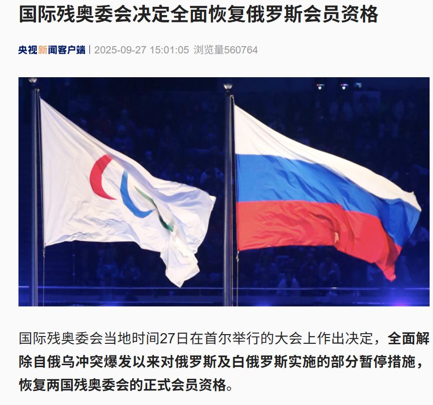 国际残奥委会当地时间27日在首尔举行的大会上作出决定,全面解除自俄乌冲突爆发以来对俄罗斯及白俄罗斯实施的部分暂停措施,恢复两国残奥委会的正式会员资格。
